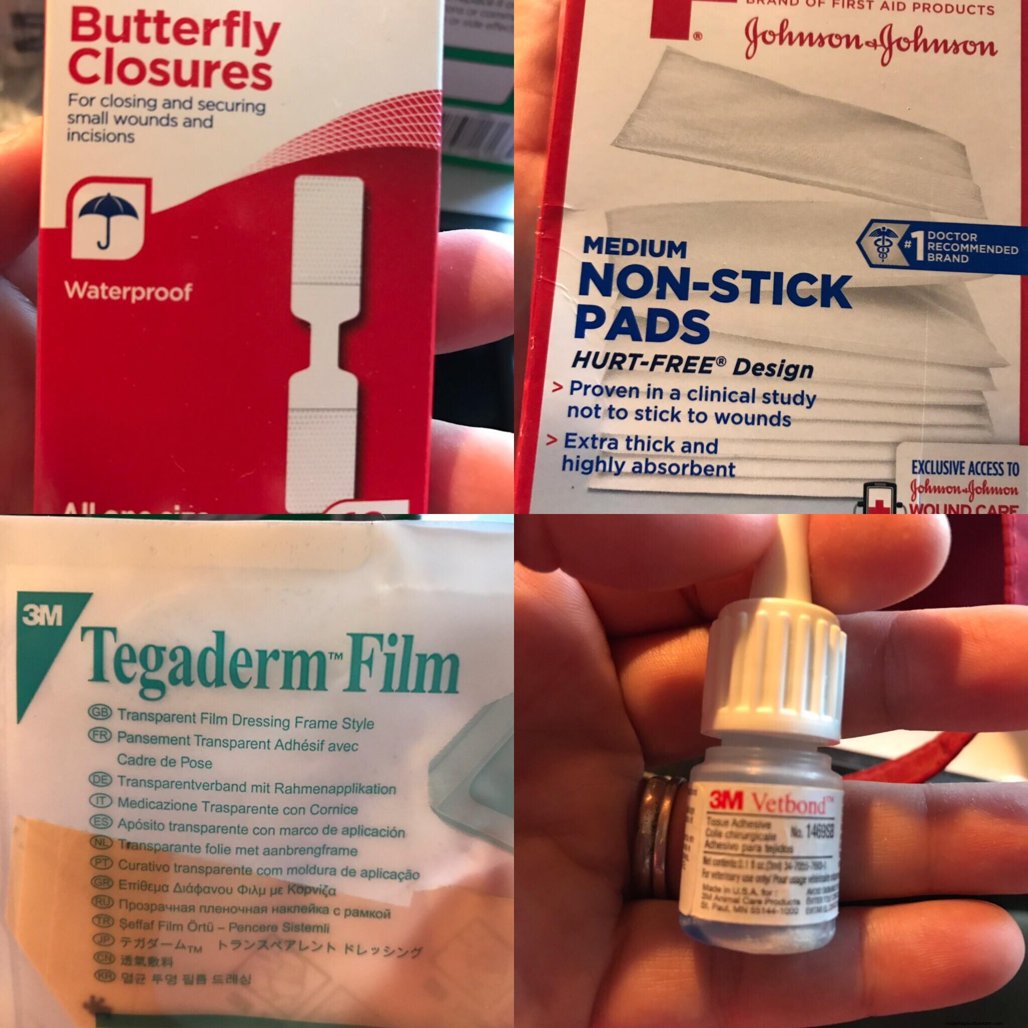 Butterfly closures are good for pulling together open wounds. I also have veterinary “super glue” that I use to close wounds.