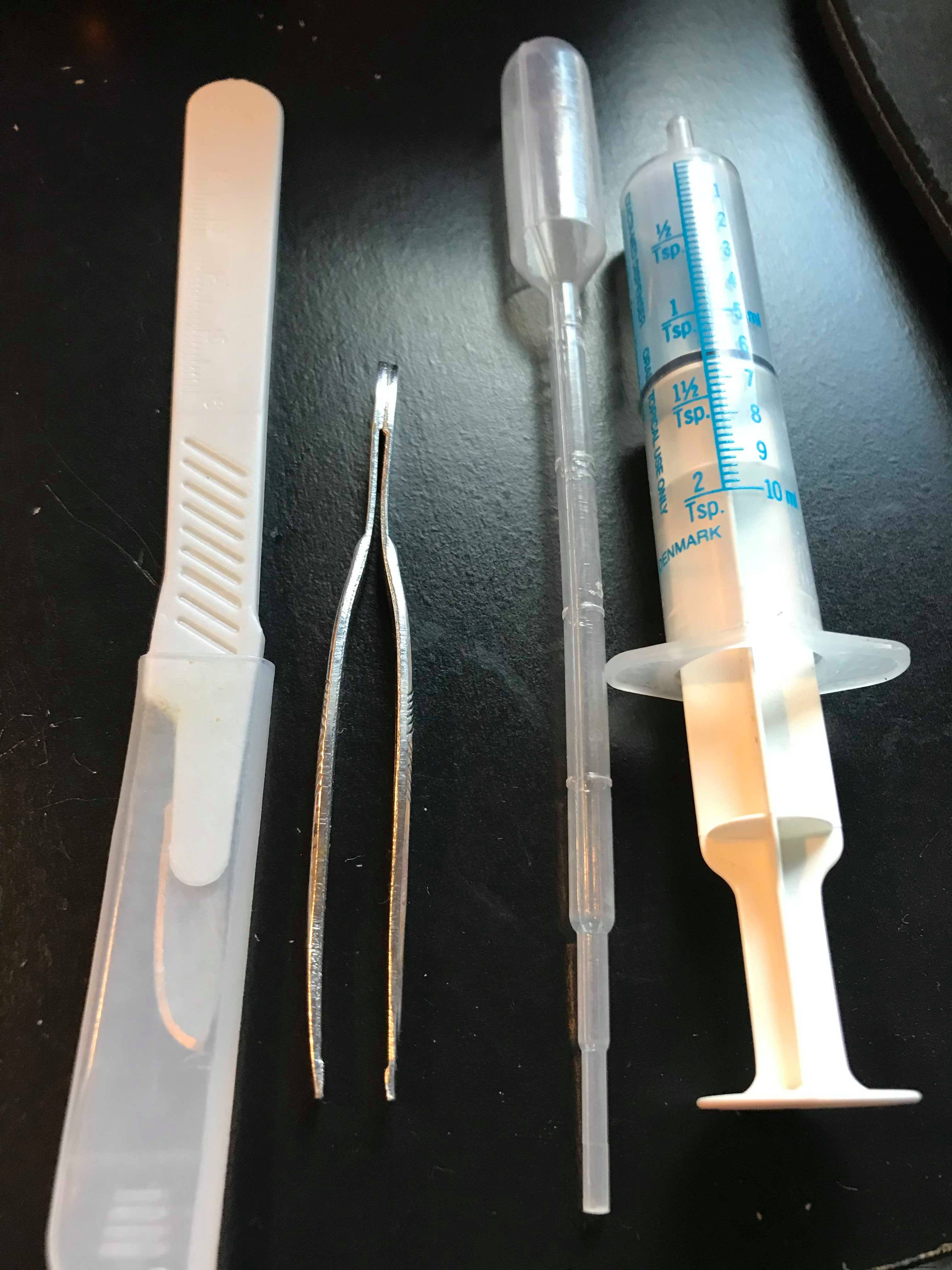 Disposable scalpels, tweezers, pipettes and syringes are all handy tools.