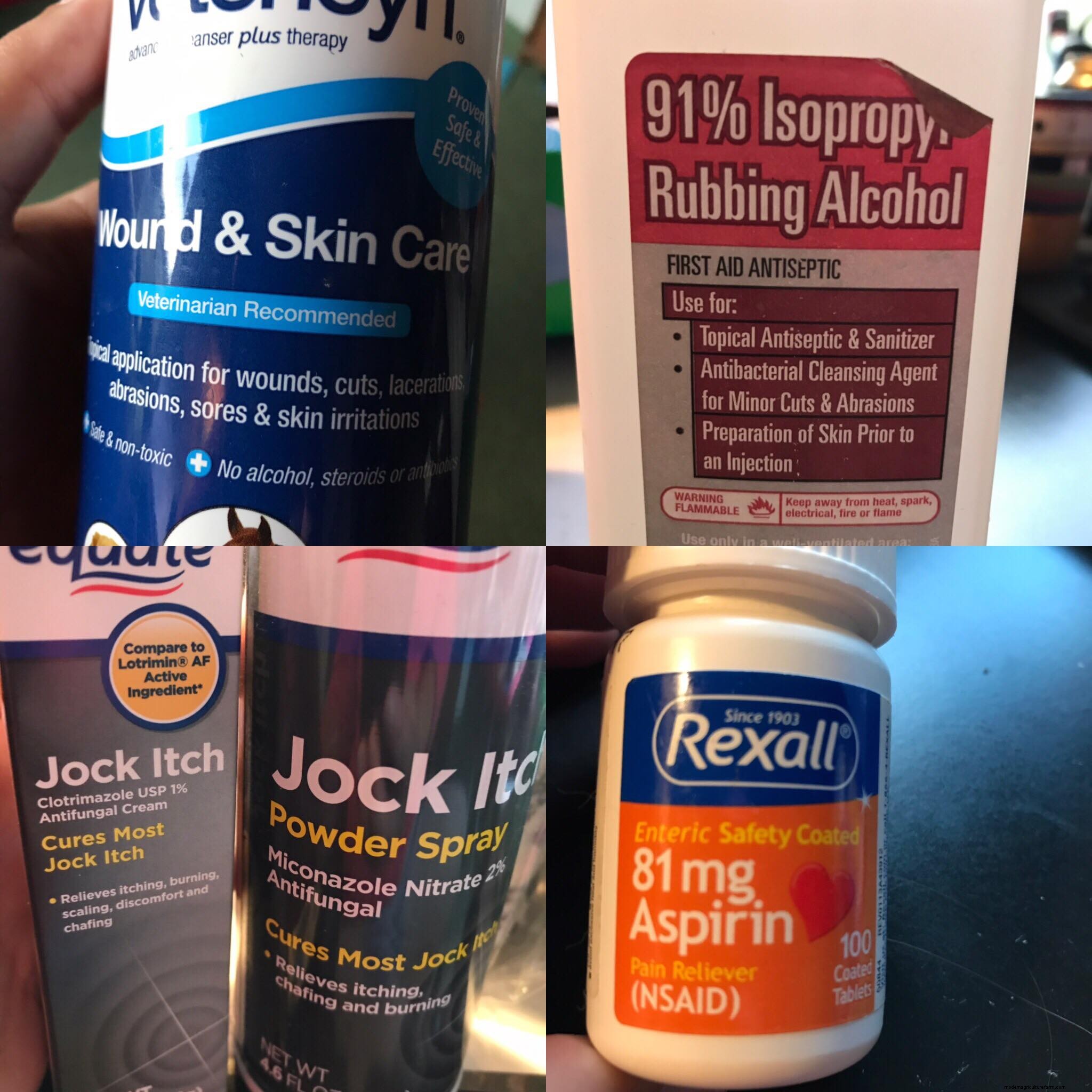 Wound spray, alcohol, a variety of ointments and aspirin for pain relief all have a place in my first aid kit.