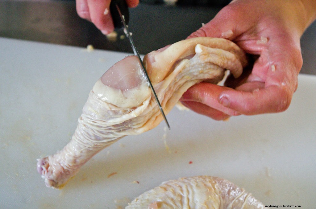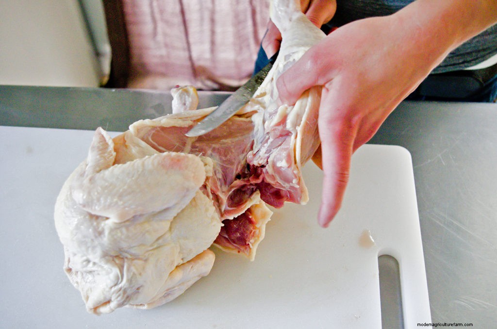 Cut through the skin between the breast muscle and the leg, to access the leg joint.