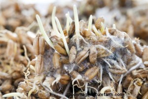 These molds get into grain with the help of insects that attack growing or stored crops and break down the protective hull of individual kernels, opening the way to mold penetration. Grains that are deliberately cracked or crushed to make them easier for chickens to digest, when stored improperly or for too long, are also subject to mold contamination.