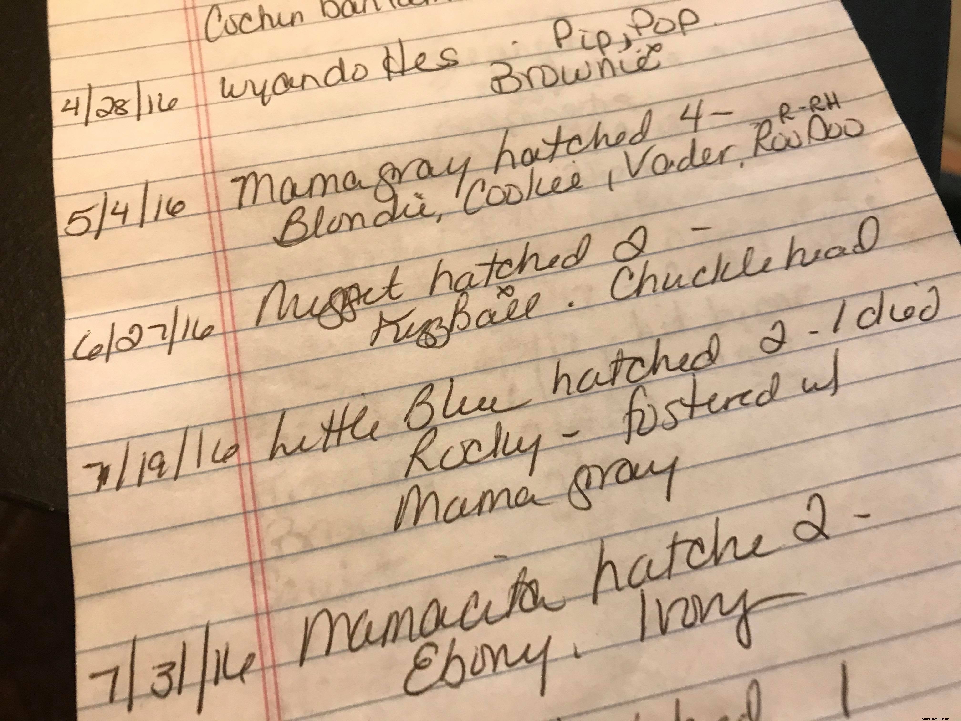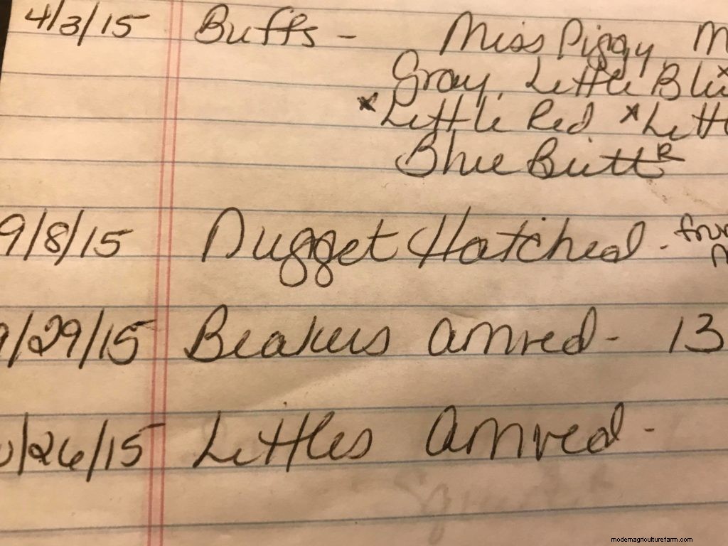 The first thing I started keeping track of is when I acquired chickens and where they came from. Specifically, I note the date and whether I bought them at the feed store or they hatched under one of my broody hens.