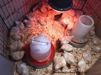 Plastic sheeting is laid down with 3-inches of pine flake litter. A tarp is draped over the temporary brooder which helps to retain heat and a sense of security for the young chicks. Thirty minutes later, with feeder and water in place you are ready for the chicks.