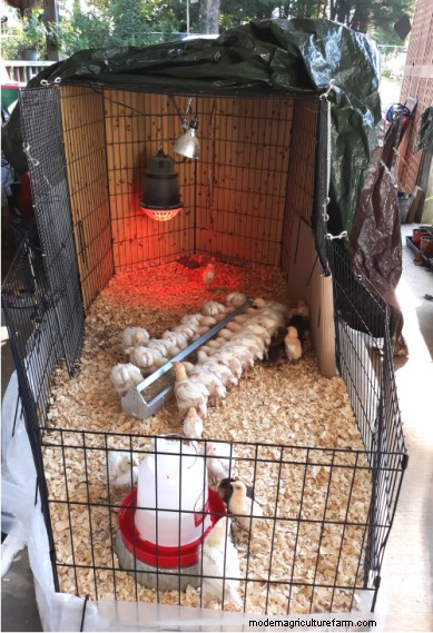 -The brooder space is supplemented by a small attached daytime run bringing total square footage up to about one-square-foot per chick.