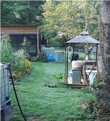 You can see the coop run set up in the back of this photo, 60 feet from my house.