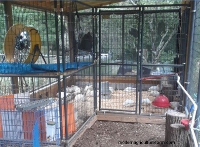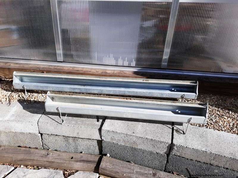 – AT the far end of the run, I place a hanging waterer and 3-foot trough with spinning reel that discourages perching (and the inevitable manure in the feed) are placed in the attached pen at 3rd week.