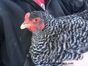 Junior here looks like a barred rock, but she lays green eggs.