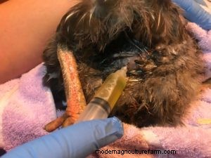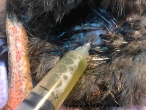 Use the syringe to draw off about 4 or 5 ounces of fluid. You don’t want to draw off too much because that can send the hen into shock. If your syringe isn’t large enough to hold all the fluid, carefully remove the syringe from the needle, leaving the needle inserted in the hen. This will allow the fluid to drain on its own, but you should try to catch it in something so you can observe how much you are draining.
