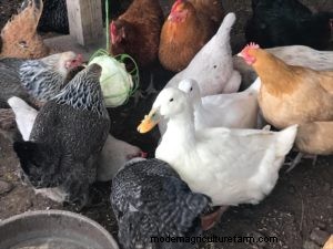 My mixed flock currently consists of several dozen chickens and three white Pekin ducks. They live together quite harmoniously.