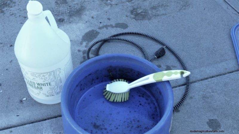 To avoid algae growth in waterers, regular cleaning is important. Photo by author.
