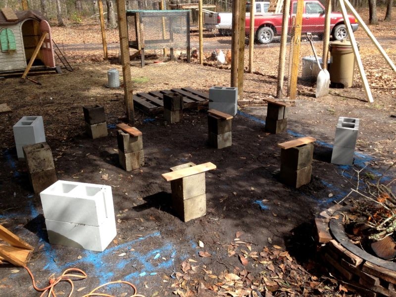 Whole pallets laid on flat ground determine the foot print of the pallet coop. Blue paint marks their corners so cinder block piers can be placed correctly. Wooden shims create a level surface on which to lay the pallets. In the background, Katie had re-purposed kids’ discarded playhouses as temporary coops.