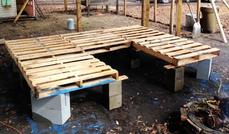Use a 4-foot plumb-stick to check for level. You may need to dig down a bit or add a wooden shim to get their tops at roughly the same level. Then gently place the pallets on the cinder blocks to make your floor framing. There’s no need to fasten the pallets to the cinder blocks. Short of a hurricane, its weight will keep it in place.
