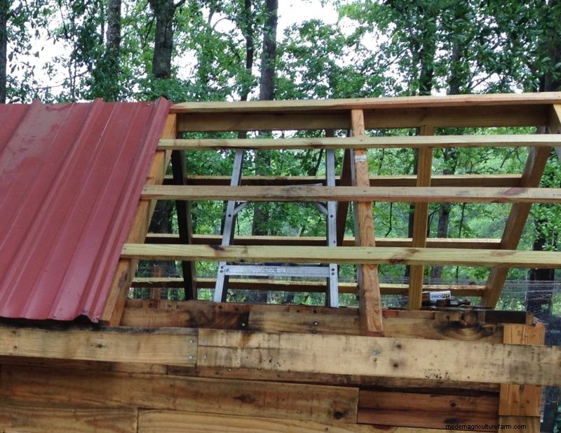 Cutting and installing roof rafters like that can be a challenge even for experienced carpenters. The good news is, if you’re building a smaller coop, you can avoid that hassle and expense by using pallets for the roof framing too.