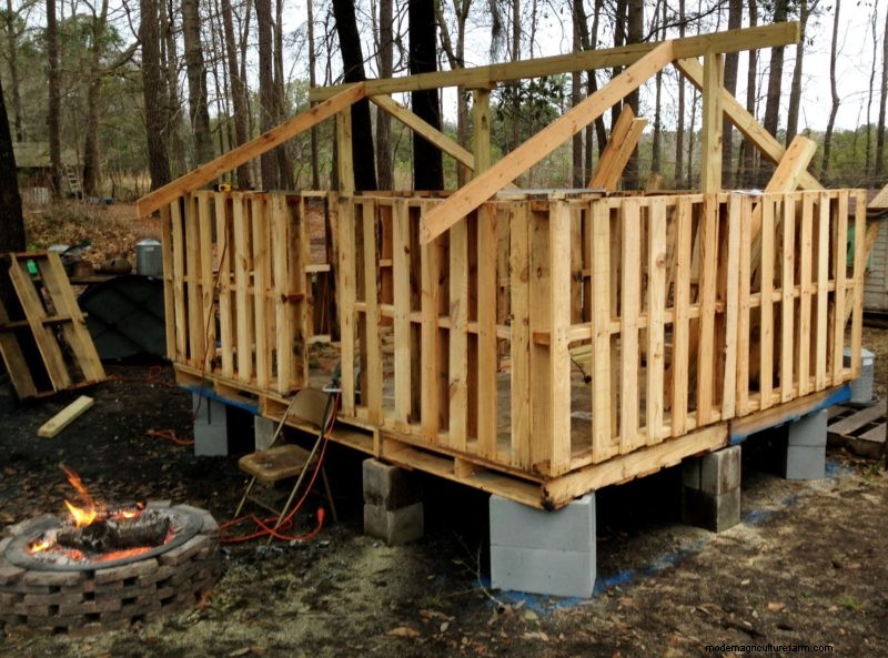 At this stage, Frank, Johnny and Katie had been working a total of three hours to install the piers, floor, walls and part of the roof framing. Pallet coops can be built quickly.