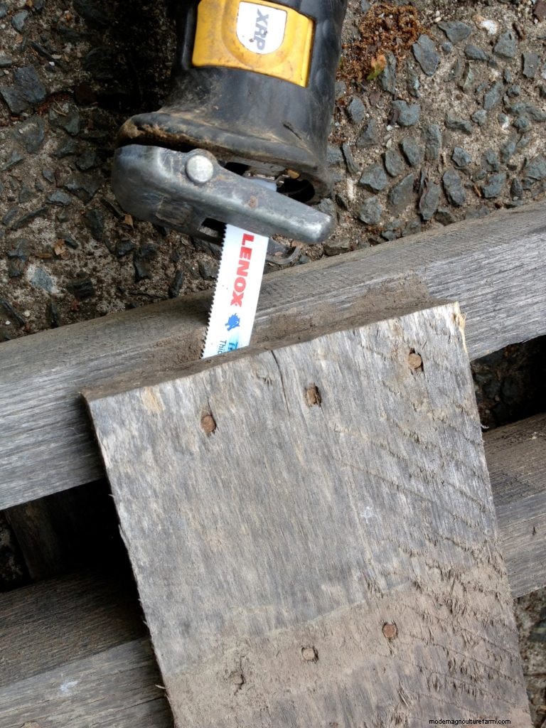 A sawzall cuts through the nails of pallets four times as fast as you can pull them apart and back out the nails. Slip the blade between pieces of wood as shown here.