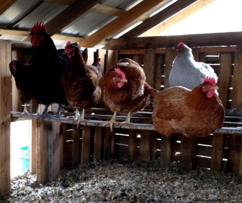 Interior of the pallet coop, showing (L-R): pop door, hens on roost, pallet walls covered by pallet siding, coop gable covered by hardware cloth for security and ventilation.
