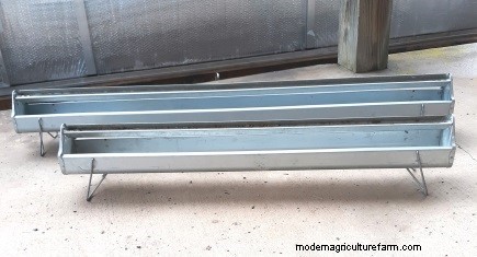 The 3-foot trough feeder is swapped for a 4-foot trough feeder, providing 8 linear feet of feeding space and reinforcing positive feeding behaviors, since they all can feed side by side. Feed is stored in galvanized steel cans within the grow-out pen, enabling quick feeding.