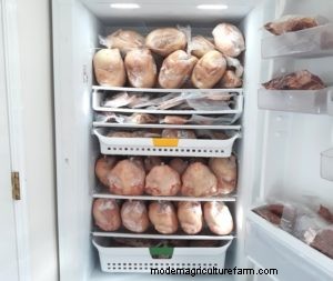 By raising Cornish Cross broilers in two batches, I can finish 25 pullets in the grow-out pen while starting 25 chicks in the brooder, spreading out the effort over 16 consecutive weeks, and spreading out the work so that I can handle it by myself. During hot summers, I split the batches into “spring” and “fall” groups, because, at 2000 feet elevation, Cornish Cross broilers have difficulty with the heat. Also, 50 Cornish Cross broilers take up quite a bit of refrigerator space for a three-day cool-down; I only have space for 25 chickens. Typically, I process at two finish weights: one batch at 8 weeks for 6-pound fryer weight and a second batch at 6 weeks for 4-pound rotisserie weight. Fifty birds just about fill my 21-cubic-foot upright freezer. It’s all about managing resources. It’s never fun to start processing 50 Cornish Cross broilers and find out you have no place to put them!