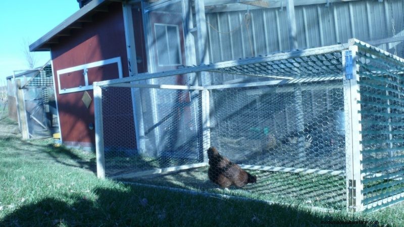 At first, the older hens might “defend” their territory by standing guard over the strange newcomers. But once they get used to seeing the newbies, hopefully daily for a couple of weeks, they’ll go on about their business. I let my new chicks play outside in the temporary pen for about two weeks, long enough to get both the new flock and the older flock used to each other. The pen is temporary, so it’s not predator-proof. In the evening, I take them inside the garage to their brooder pen.