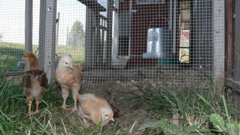 Chicks are out for a short visit beside the big pen. They’ll continue to go back to their brooder until they’re fully feathered. Photo by author.