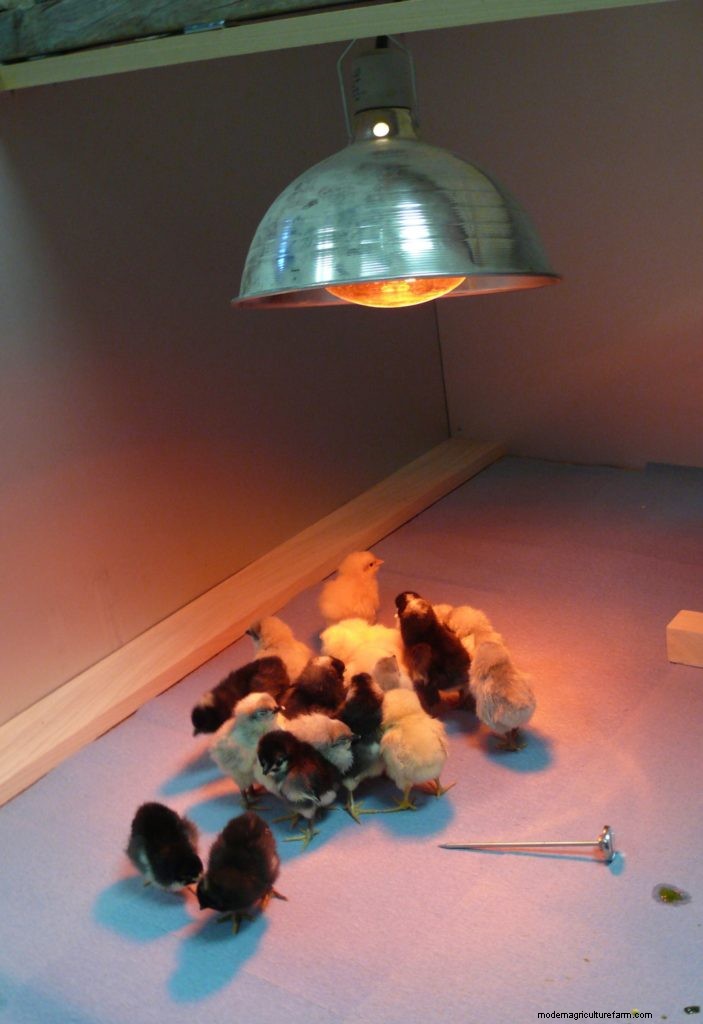 Baby chicks will have a natural instinct to peck—at food, the floor, and each other. Bright light causes stress in chicks and can lead to pecking, so use a red lamp bulb for heat. Each week or so, raise the heat lamp higher so that the floor temperature gradually decreases about 3 to 5 degrees. After the 8th or 9th week, they should be comfortable in room temperatures of about 65 to 68 degrees. Make sure to turn off any overhead lights at night.