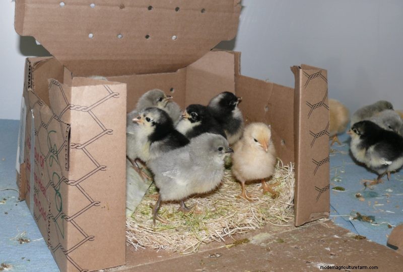 Most large poultry hatcheries box up new chicks for shipment in a ventilated cardboard box with a hot gel pack to keep chicks warm. Hatcheries ship chicks out as soon as possible after hatch. Chicks can live off their own yolk sack for 48 hours after they’ve hatched, and hopefully your chicks arrive in this window.