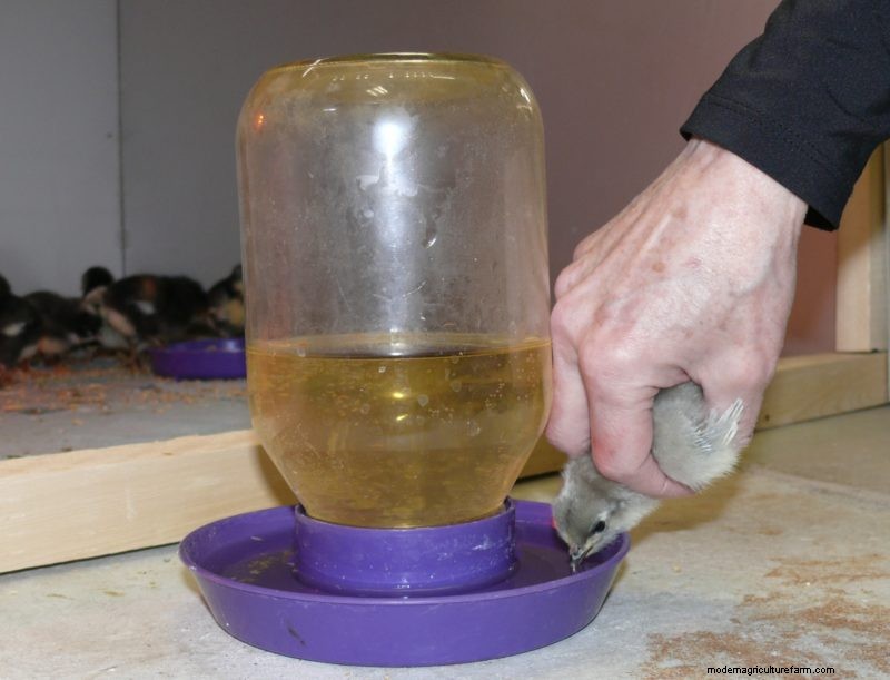 As you place the baby chicks in their new brooder home, they’ll need to find their bearings. Pick chicks up and dip their beaks into the water, making sure they’re swallowing. Baby chicks will drink lots of water, so it’s good to invest in a chick waterer. Avoid using open bowls, as tiny chicks fall into bowls face first and sometimes don’t make it out. They’ll also walk into open bowls and get wet, causing a chill, which isn’t good for them.