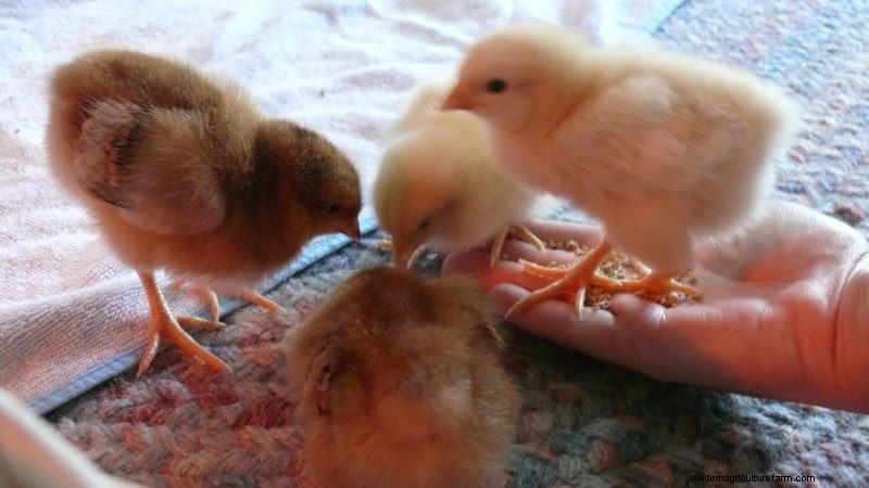 Only use a chick starter feed of about 18 percent protein, which promotes muscle development and growth. You can supplement grain with some mashed egg yolk. If they’re not eating their feed, putting a little egg yolk on top of their feed will entice them to eat.