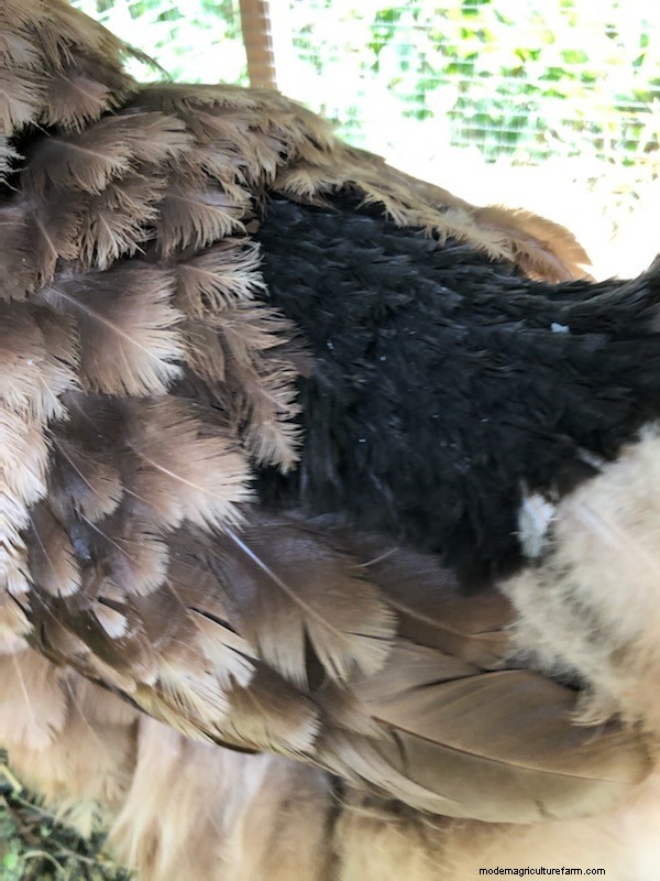 Wally’s feathers growing back in on her back, a contrasting chocolate brown.