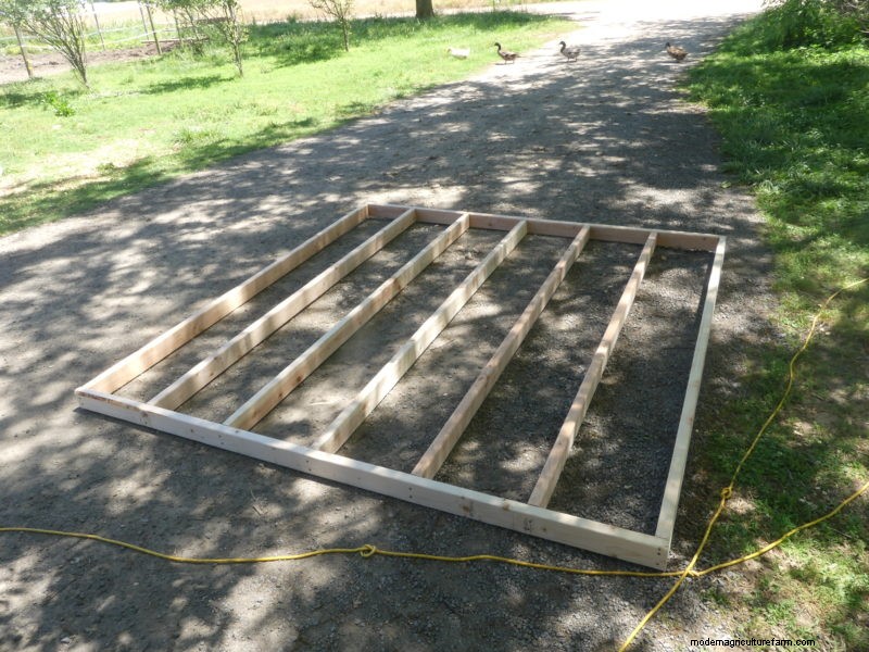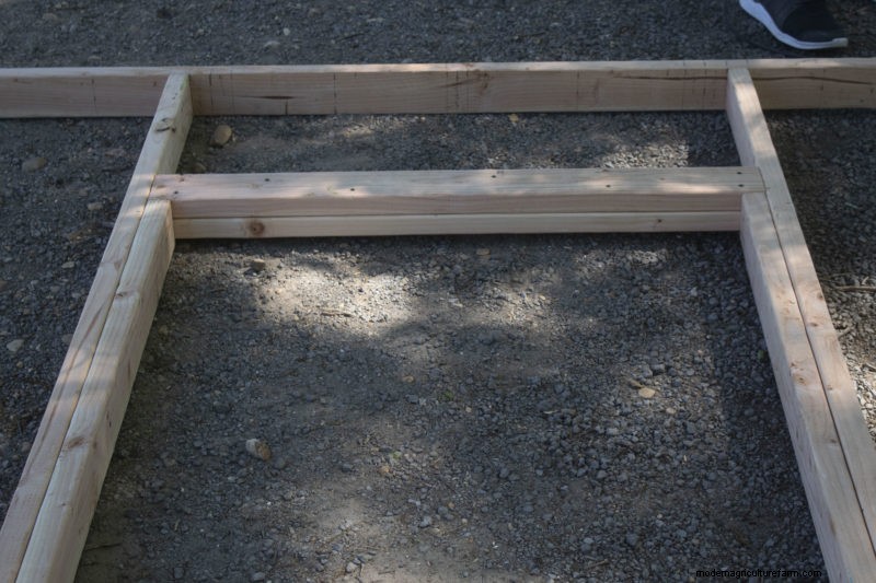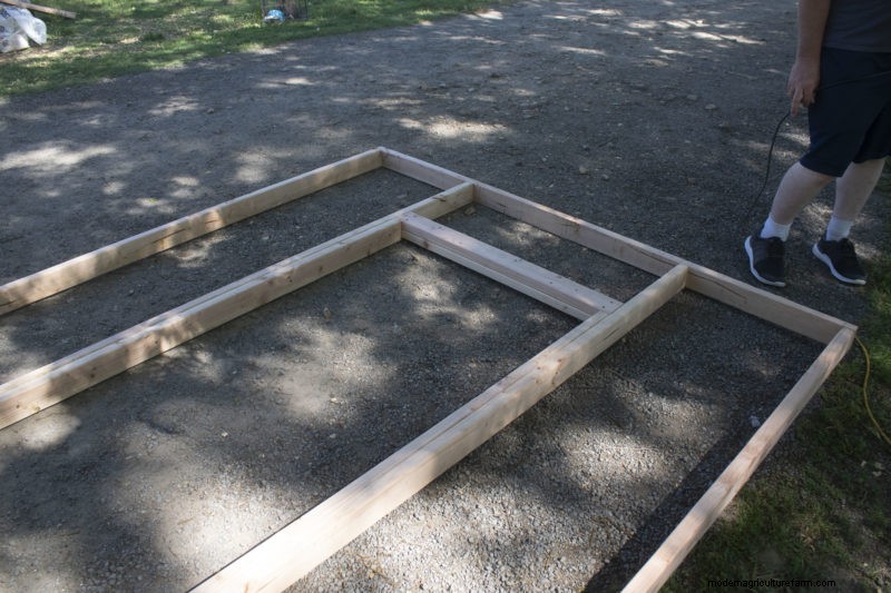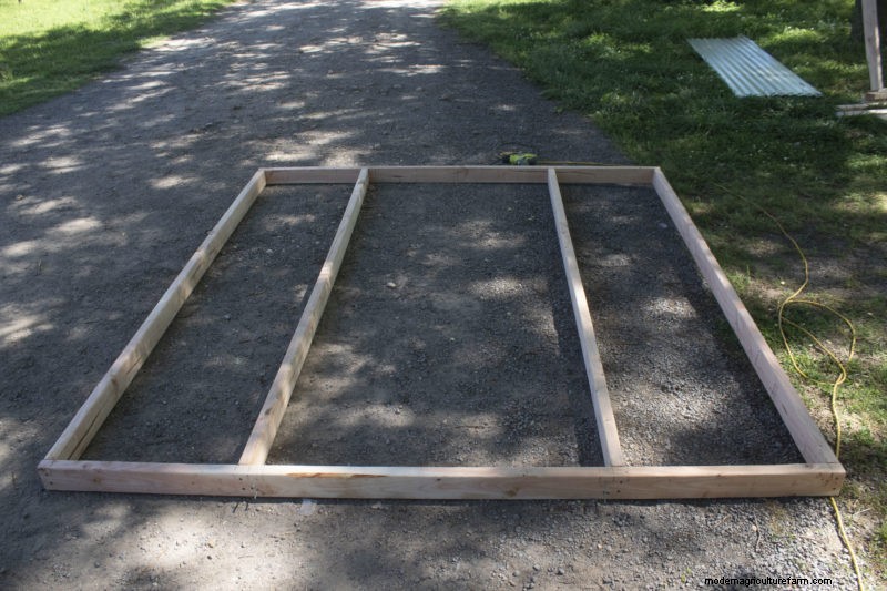 While a lot of coops use a dirt floor, we built a floor that uses a frame and joists so our coop is more stable. We first pre-measured our boards and mapped out the floor on the ground prior to permanently attaching it together. Using 2-by-6-by-8-foot boards, we could easily lay out the floor without cutting any wood.