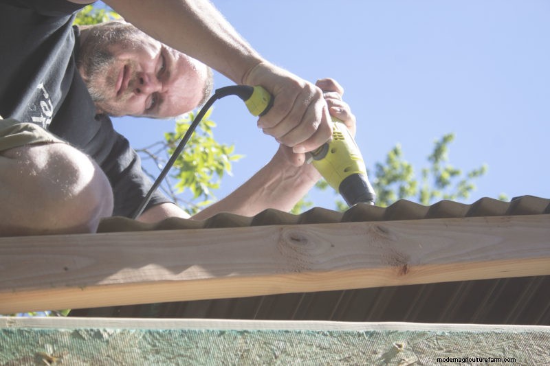 To complete the roof, we used corrugated metal roofing. It’s cheaper than OSB and shingles, and it’s faster to install. To attach the metal to the supports, we used roofing screws. They ensure that the roof stays waterproof, unlike regular screws. They’ll also provide more strength during windy days and foul weather, and it’s less likely we’ll lose part of our roof to wind gusts. To make this part easier, we used a magnetic bit, which prevented the screws from falling as we installed the metal roof.