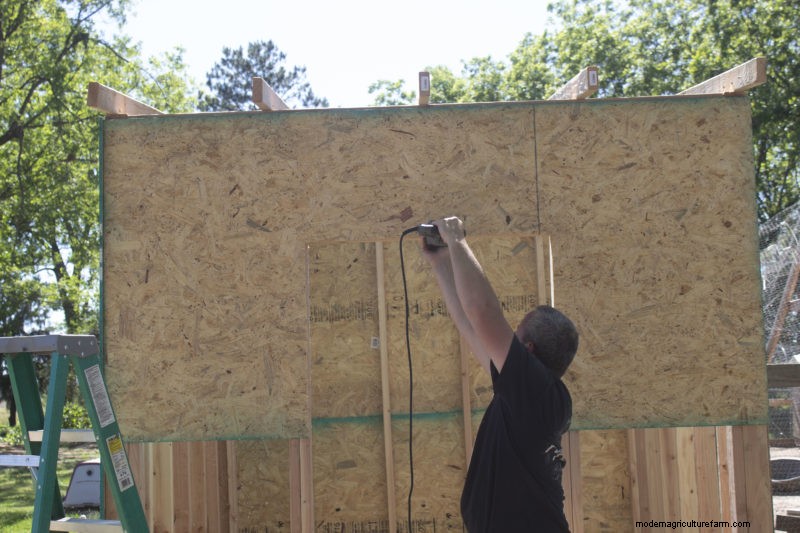 Finishing the walls was simple. Because the OSB was 4-foot-by-8-foot, we didn’t have to trim any of it, except around the doorframe. We used 1-5/8-inch screws to secure the OSB to the wall frames, making sure to attach the OSB on the studs, both on the perimeter of the wood and in the center. A second person makes this step easier because they can help you hold up the 8-foot-by-4-foot OSB, and help you determine where the studs are located. When we built our coop, it was windy. Having two sets of hands helped keep the boards in place before they were fully attached to the frame.