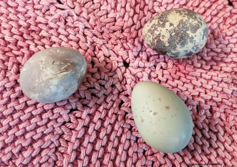 I discovered that collecting spotless eggs was more of a challenge than I had anticipated. It turned out to be a little tricky finding quail eggs that didn’t need a bit of washing, especially since quail lay eggs all over the coop and not in a designated area. Eggs were collected a couple of times a day, and I put a fresh layer of pine bedding down daily to help keep the new eggs clean until I could get to them. I gave myself a week-long window to collect eggs and managed to get enough for a small test batch.