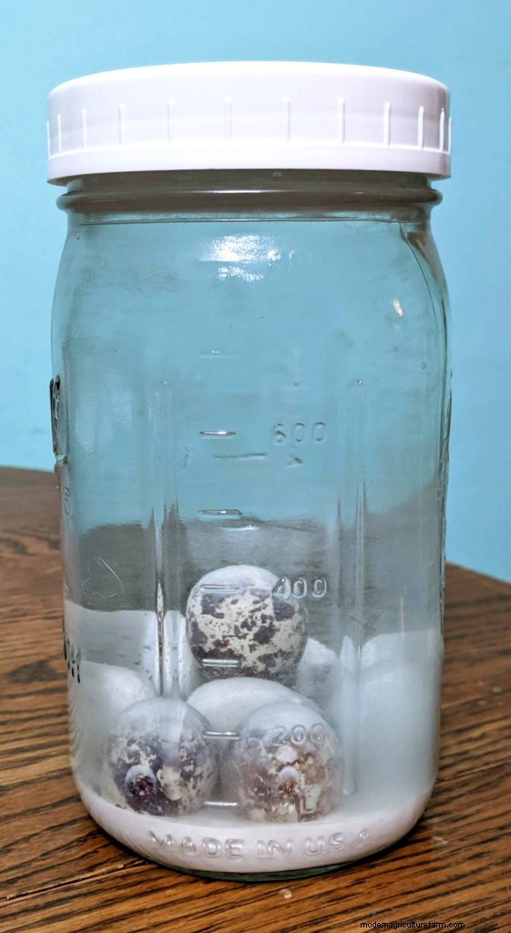 The term “water glassing” comes from the appearance of sodium silicate when it is combined with water. As the water evaporates, the solution then turns to a solid, glass-like substance. Sodium silicate was likely the original ingredient in early water glassing recipes, and over time calcium hydroxide has become more popular in modern day recipes and is arguably easier to source. Calcium hydroxide goes by many names, including hydrated lime, slated lime, and pickling lime. It is made from burning limestone, shells, and bones, which are then rehydrated with water.