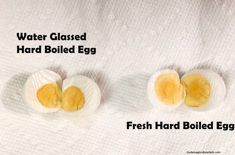 I didn’t notice any difference in taste between the hard-boiled eggs, although in peeling them the membrane of the water glassed one was just a little tougher. The textures were very similar, as well. The water glassed egg had a little bit less of a rubbery chew than the fresh one.