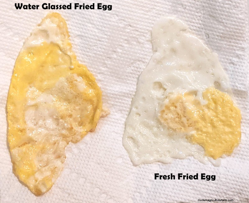 With frying the two types of eggs, I noticed the water glassed egg yolks tended to cling to the membrane inside the shell, and it was not possible to remove the yolk fully intact. The yolk and white, as well, were a little more watery and not quite as distinct from each other. However, the flavor of the water glassed egg was actually tastier and richer than the fresh one! This may have been, in part, because the white and yolk were more integrated.