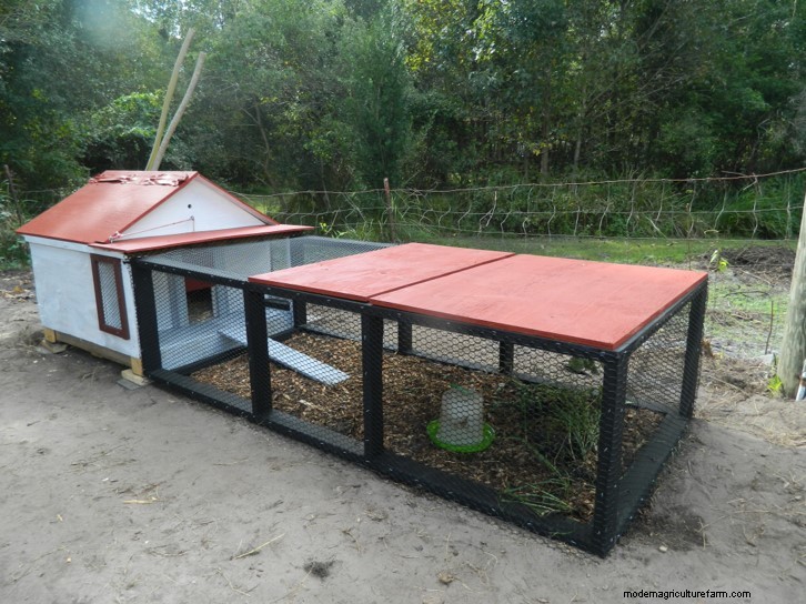 Hutches in the backyard. The roof helps protect them from being spotted by flying predators.