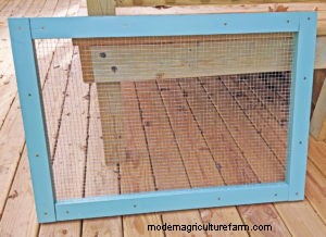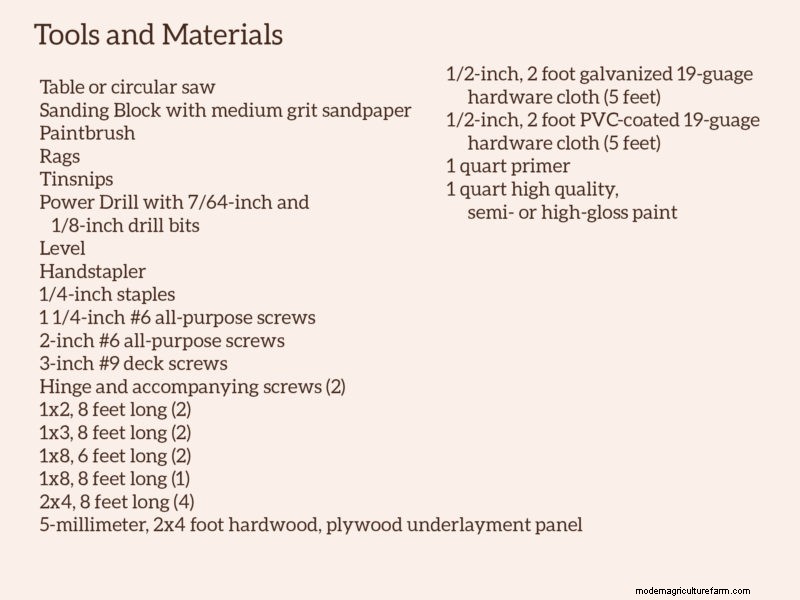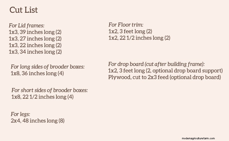 After they are large enough, this is the house they’ll live in. Read about housing your quail in Housing Coturnix Quail.Before constructing the brooder, there are some details regarding materials you should consider. While cedar boards might seem tempting, this aromatic wood isn’t suitable for quail or other fowl. It can cause respiratory problems and is best avoided. I would also strongly discourage using treated lumber. I chose to use both PVC-coated and galvanized hardware cloth. I envisioned the heat lamp resting directly on the hardware cloth on the lid in the early days of brooding to keep the chicks warm, so I wanted to avoid direct contact between the lamp and the PVC-coated hardware cloth. Therefore, the galvanized hardware cloth is used exclusively on the lid. On the other hand, PVC-coated hardware cloth is perfect for the floor of the brooder, to help keep it clean and make cleaning easier. Mold- and mildew-resistant primer is best. Any low- or zero-VOC (volatile organic compound) paint is ideal, and I highly recommend semi-gloss or high-gloss to make cleaning easier.