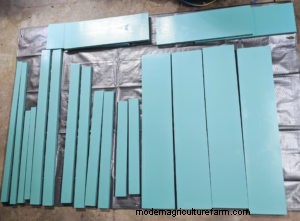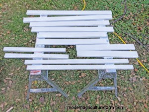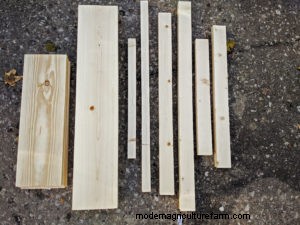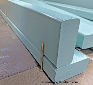The first step is to construct the lid of the brooder, which is made up of 1×3 boards. The lid is made of two frames, with the galvanized hardware cloth sandwiched between them. On a level surface, lay out the two 27-inch boards and two 34-inch boards that will make up the first lid frame. The 34-inch boards will sit inside the 27-inch boards. Then, lay out the two 22-inch boards and two 39-inch boards that will make up the second lid frame. For this frame, the 22-inch boards will sit inside the 39-inch boards. While both frames yield the same dimensions of 39 by 27 inches, the arrangement is offset to give added strength.
