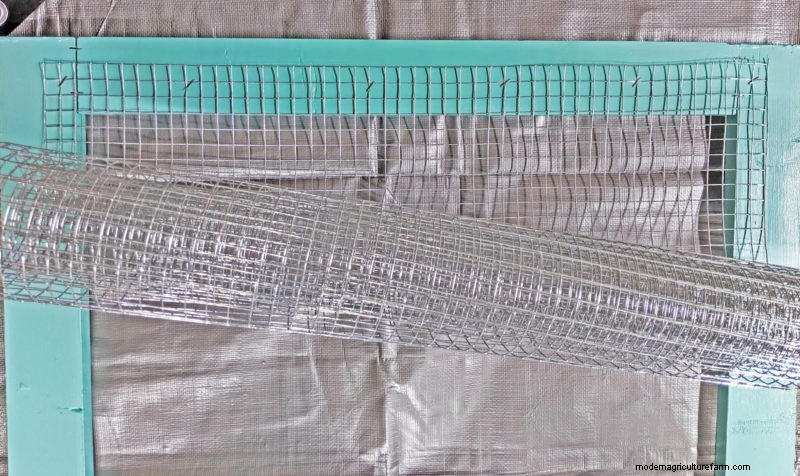 Unroll the hardware cloth down the length of the frame, keeping moderate tension on the roll and stapling it every few inches on each side, making sure to keep it taut across the opening. When you near the end of the frame, measure 1½ inches in from the edge, cut the hardware cloth with the tin snips to this length, and finish stapling.