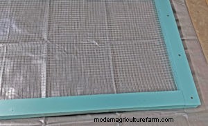 Next, staple the galvanized hardware cloth to one frame, using the same ¼-inch staples. Line up the 2-foot side of the hardware cloth with the short end of the frame, and then center the edge of the hardware cloth on the board, so the cut ends will be completely hidden once it’s sandwiched between the frames. Staple the hardware cloth down every few inches across this board. (I try to staple diagonally across the intersection of wires to avoid possible movement later.)