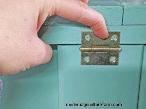 Place the lid flat on top of the box unit, lining up the outside edges of the lid with the outside edges of the legs. Decide which side of the brooder will be the back, and then install one hinge centered on either leg on that side.