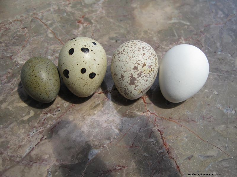 The Chinese blue-breasted quail egg is on the far left. The center left egg is a Japanese Coturnix, while the right two eggs come from northern bobwhite quail.