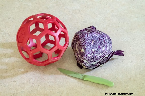 - Fill the ball with fruit or vegetable scraps that your flock can enjoy! Cabbage, chunks of zucchini, summer squash, carrot peelings, berries, apples, and watermelon all make great piñata fillers that chickens love!