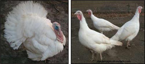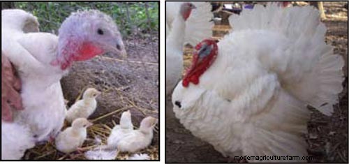 Midget White toms weigh 16 to 20 pounds; hens 8 to 12 pounds. Taste-wise the Midgets are the hands-down favorite at our table and we rank them number one. They lay a surprisingly large egg for a small hen, which can cause prolapse problems with young hens on the first laying cycle. They tend to be early layers but go broody quickly, are good sitters and do well at raising poults. In temperament, they are calm natured. The hens can be fence jumpers due to their lightweight.