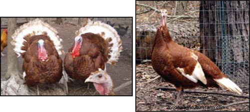 Bourbon Red – Named for Bourbon County in Kentucky where J. F. Barbee developed them in the late 1800s. Due to their size, they were a popular meat bird. An interesting note: the Bronze, White Holland and Buff turkeys were bred together to develop the Bourbon Red. The color came mostly from selection from Buff. They were recognized by the APA in 1909.