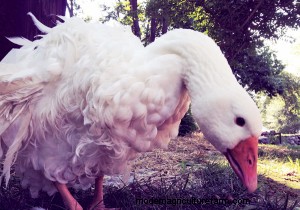 Sebastopols weigh 10 to 12 pounds. They have elegant, arching necks that evoke images of swans. Their eyes are bright blue, a pleasing compliment to their orange bills. The Sebastopol’s frame is compact, appearing larger than their true size because of the mass of feathers that puff from their back and breast. The unique feathers of the Sebastopol are long and wide, with flexible shafts. These spiraling feathers will often cascade in long waves all the way to the ground.