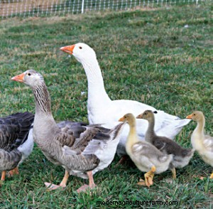 When considering geese I always recommend raising them by hand. Find a breeder with a good reputation and strong stock. The heritage of a goose will affect its personality, weight and egg production later in life. A goose’s personality is further shaped by how it is raised. “Imprinting” is what happens when a goose identifies with the person it sees as providing it with food. This bond is typically created in the first one to two weeks of a gosling’s life, and they will remain bonded to that person for life, even if they pair with another goose as an adult. A gosling will follow its imprinted human around with more adoration than a puppy. Once fully grown, their behavior may become more aloof, but they will still prefer the company of those they have imprinted on. Much of the reputation of aggression in geese stems from geese protecting their humans.