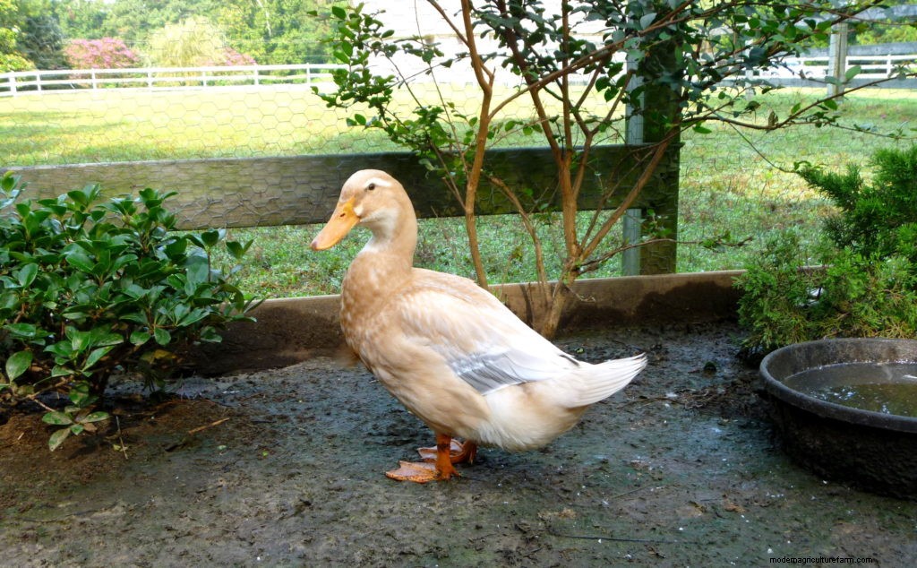 Hen: Bill is yellowish to brownish orange; dark bean is permissible in mature birds. Head and neck are fawn-buff highlighted with bold creamy white stripes above the eyes and creamy white highlights on the throat and front of the neck. The body is fawn-buff with some blue shading. Wings are oatmeal highlighted with blue-gray, silver, and creamy white. – Storey’s Illustrated Guide to Poultry Breeds
