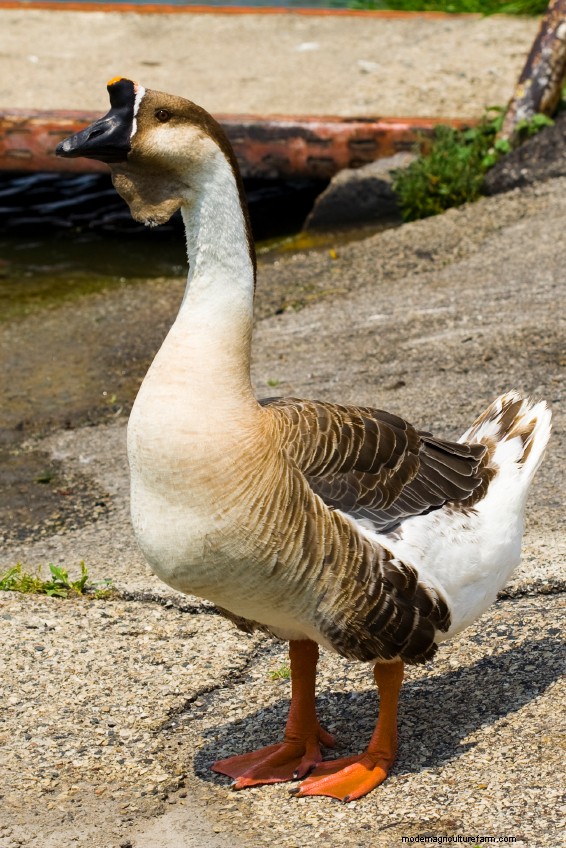 Originating in China, the Chinese goose is similar in appearance to the African but lacks the dewlap. It may be either white and brown, with the brown variety having a larger knob than the white. Like the African, Chinese geese need protective winter shelter to prevent frostbitten knobs. This domestic goose breed is the one most commonly employed for controlling weeds. Being both active and small, they do a good job of seeking out emerging weeds while inflicting little damage on established crops. Thanks to their light weight and strong wings, they can readily fly over an inadequate fence. Chinese geese are prolific layers. In contrast to heavier geese, they produce a high rate of fertile eggs even when breeding on land rather than on water. Like African geese, the young grow relatively fast and have lean meat.